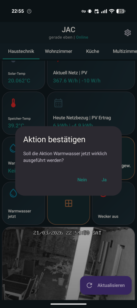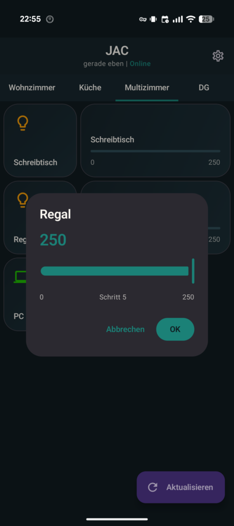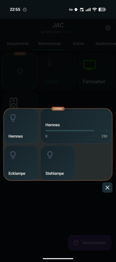 Im Alltag zeigt sich die Stärke vor allem in der Vielfalt der Widgets. Neben klassischen Kacheln mit Icon und Text unterstützt die App auch Bilder, Slider, Auswahl-Dialoge und eine eigene Rollladensteuerung. Werte, Titel, Farben und sogar Icon-Namen können dynamisch aus JSON-Antworten abgeleitet werden. Dadurch entsteht kein statisches Dashboard, sondern eine Oberfläche, die auf Zustände reagieren kann. Eine Lampe kann anders aussehen, wenn sie eingeschaltet ist. Ein Select-Widget kann verfügbare Optionen direkt aus dem Backend laden. Ein Rollladen kann nicht nur Befehle annehmen, sondern auch seine aktuelle Position anzeigen.