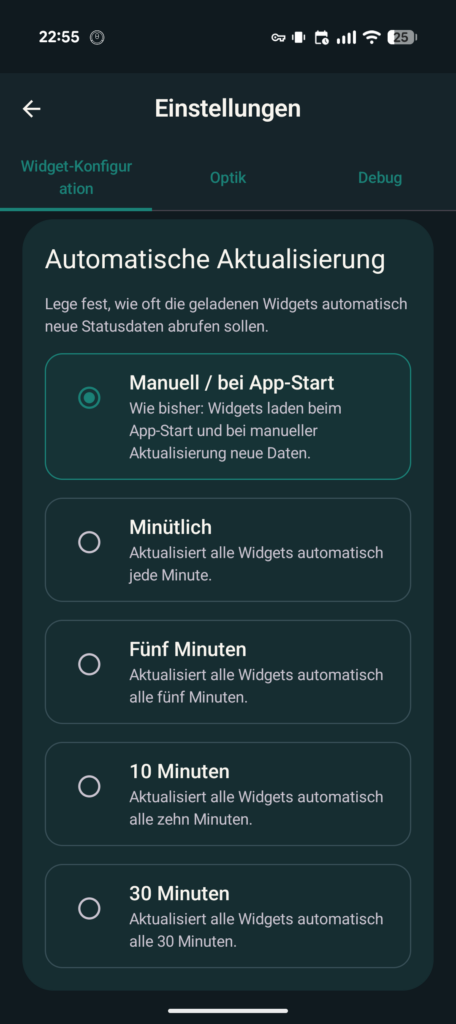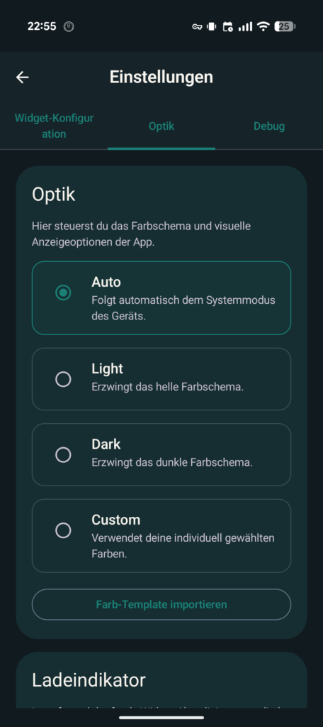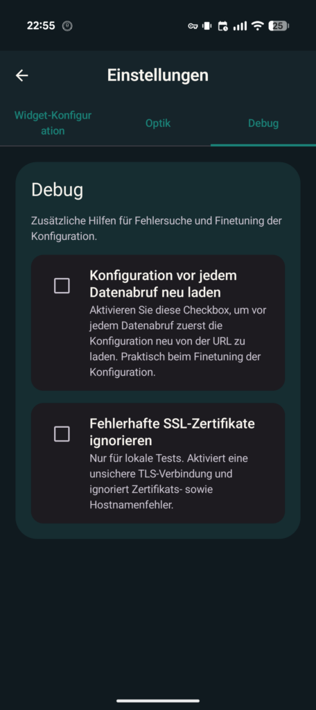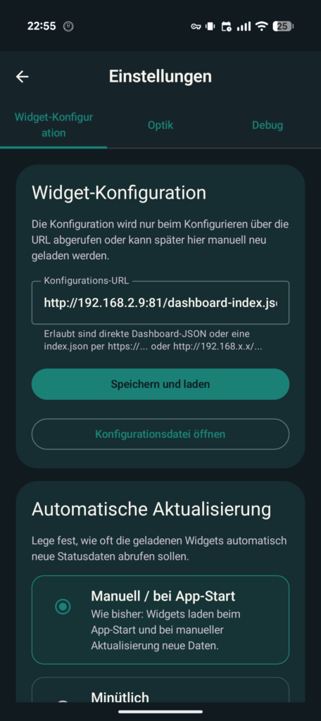 Ein weiterer wichtiger Punkt ist die Alltagstauglichkeit. Geladene Konfigurationen werden lokal gecacht, sodass das Dashboard nach dem Start schnell wieder verfügbar ist. Statusdaten können manuell oder automatisch in Intervallen aktualisiert werden. Wer an der Konfiguration feilt, kann im Debug-Bereich festlegen, dass die App vor jedem Refresh zuerst die Konfiguration von der gespeicherte URL neu lädt. Dazu kommen verschiedene Theme-Modi inklusive eines anpassbaren Custom-Themes, das sich über eine JSON-Template-Datei importieren lässt.