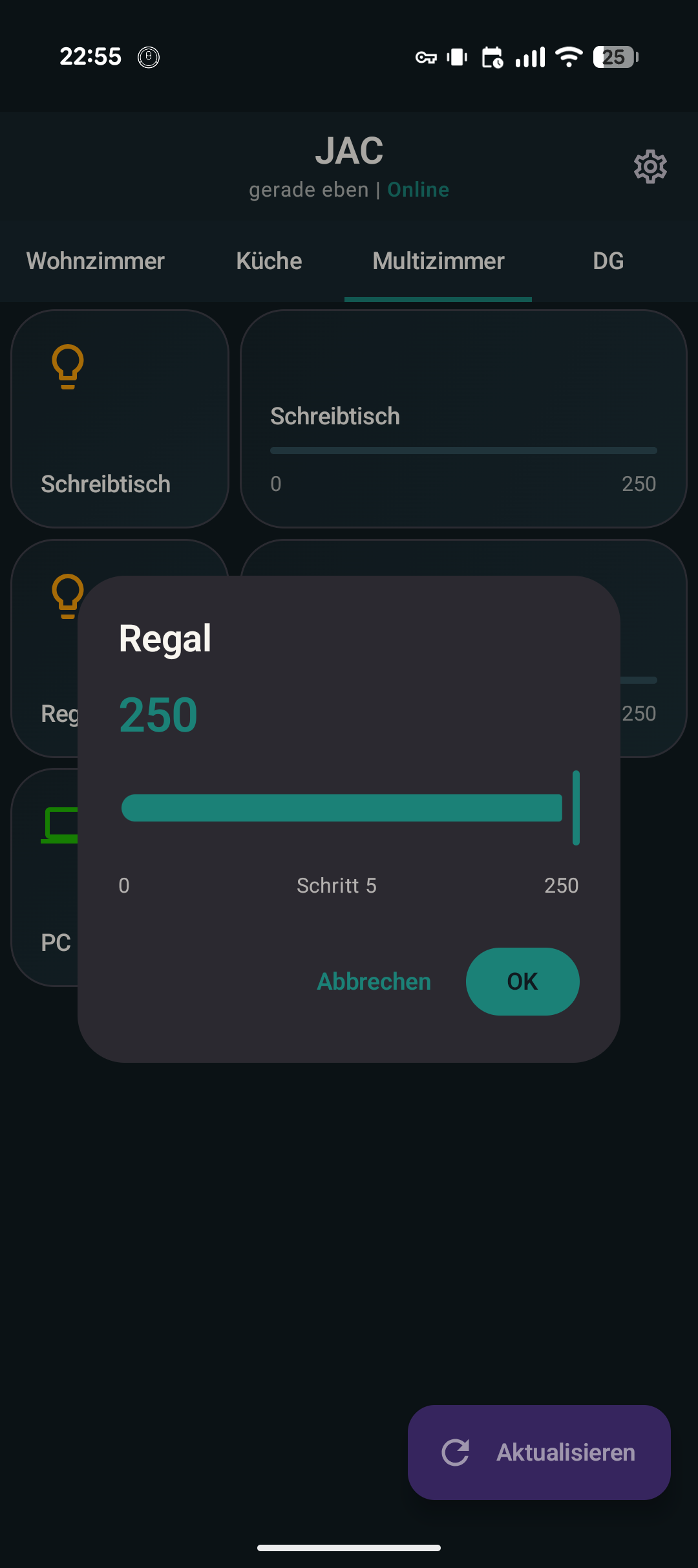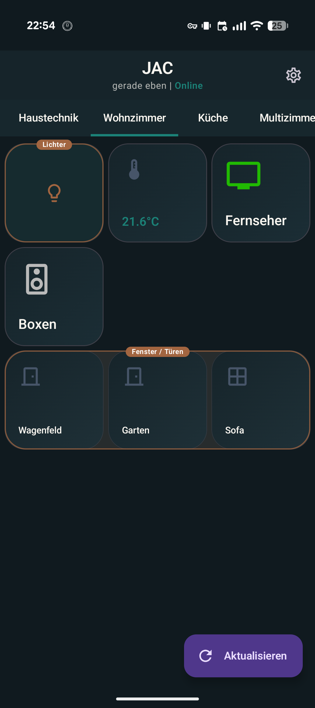 Die Grundidee ist bewusst einfach gehalten. Das Dashboard wird nicht fest in der App zusammengeklickt, sondern aus einer externen JSON-Datei beschrieben. Dadurch bleibt die App schlank und die Konfiguration lässt sich ohne Aufwand auf verschiedene Geräte ausrollen. Wer nur ein kleines Statusboard für Licht und Temperatur braucht, kann genau das bauen. Wer mehrere Bereiche, Gruppen, Tabs und spezielle Aktionen benötigt, kann die Oberfläche Schritt für Schritt erweitern, ohne auf ein vorgegebenes Schema festgelegt zu sein.