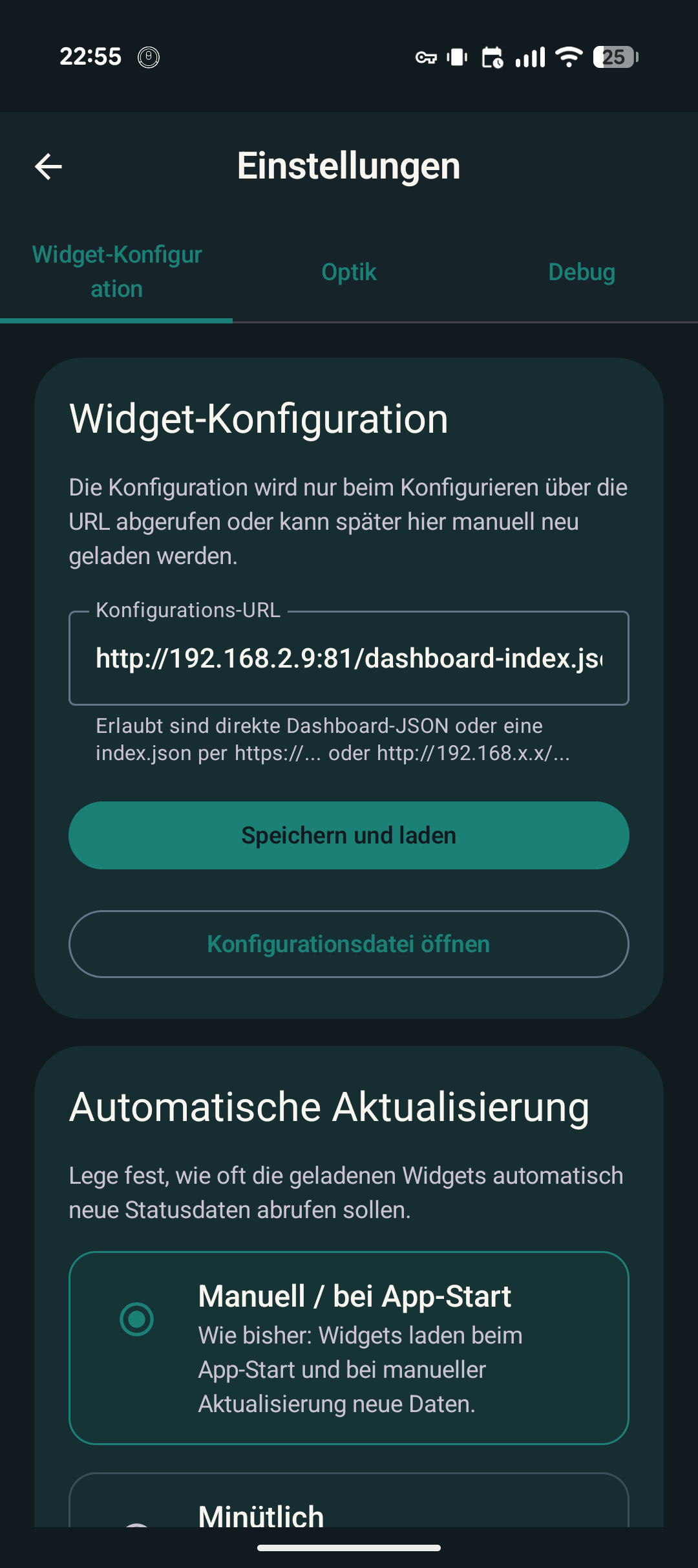 Ein weiterer wichtiger Punkt ist die Alltagstauglichkeit. Geladene Konfigurationen werden lokal gecacht, sodass das Dashboard nach dem Start schnell wieder verfügbar ist. Statusdaten können manuell oder automatisch in Intervallen aktualisiert werden. Wer an der Konfiguration feilt, kann im Debug-Bereich festlegen, dass die App vor jedem Refresh zuerst die Konfiguration von der gespeicherte URL neu lädt. Dazu kommen verschiedene Theme-Modi inklusive eines anpassbaren Custom-Themes, das sich über eine JSON-Template-Datei importieren lässt.